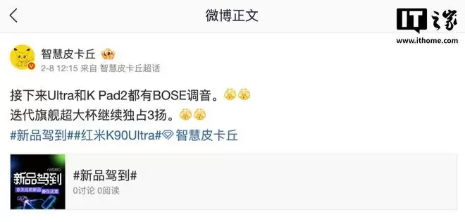 IT之家 2 月 10 日消息,博主 @智慧皮卡丘 前天在微博透露,某厂接下来发布的 Ultra 和 K Pad 2 机型都将拥有 Bose 调音的扬声器,迭代旗舰超大杯产品则是继续独占 3 扬声器