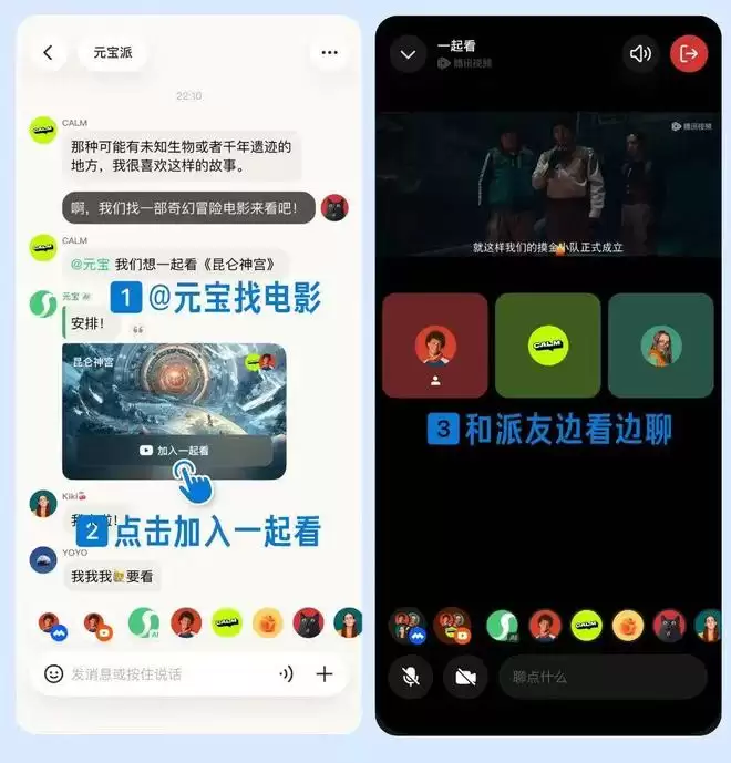 在元宝派,用户可以体验各项全新社交玩法,包括“问元宝”、“共享屏幕”、“一起看电影”、“一起听音乐”等,均将于近期陆续灰度上线。