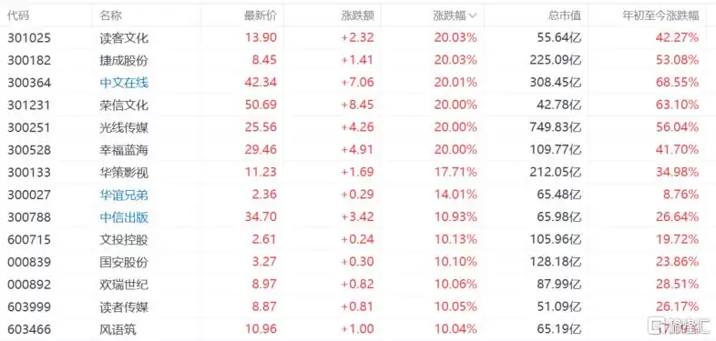 截至收盘,A股捷成股份、中文在线、幸福蓝海、光线传媒等多股涨停,长江通信涨超7%,云天励飞-U、博睿数据涨超6%,万兴科技、因赛集团涨超5%。