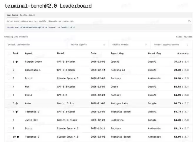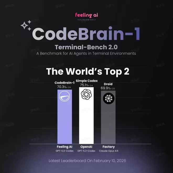 就在这个被 Anthropic 和 OpenAI 视为衡量 Agent 真实工程能力全球权威基准 Terminal-Bench 2.0 榜单上,中国团队 Feeling AI 凭借 CodeBrain-1,搭载最新 GPT-5.3-Codex 底座模型,一举冲到 72.9%(70.3%) 并跻身全球排行榜第二,成为榜单前 10 中唯一的中国团队。