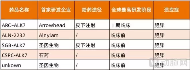 图3. 全球ALK7靶点小核酸在研管线(资料来源:摩熵医药)