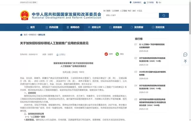2月10日,国家发展改革委等部门发布加快招标投标领域人工智能推广应用的实施意见。其中提出,围绕招标投标交易全过程和管理重点环节,按照政府引导、多方参与、场景牵引、安全可控的原则,积极稳妥推进人工智能