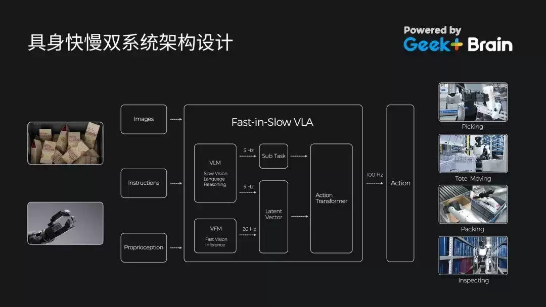 在软件层面,Gino 1搭载新一代具身智能VLA快慢协同系统,将仓储场景Know-how 与 AI 技术深度融合,使机器人能够模拟人类的认知与执行能力,在仓库内全域自主作业,并显著提升复杂任务的稳定性与成功率。该系统具备多模态融合感知、快慢协同智能架构、高频闭环动作决策中枢和数据驱动持续进化四大核心能力,整合视觉、语言、本体三重感知信息,精准识别货物/空间关系、解析任务指令、捕捉自身姿态,适配仓储复杂动态工况。通过慢系统负责高层任务理解与规划(拆解指令、生成全局策略),快系统实现实时视觉感知与反馈控制(跟踪目标、快速避障),兼顾决策合理性与执行高效率。依托这一软件能力,Gino 1 可支撑复杂场景持续可靠执行和适配仓储多样化作业需求。