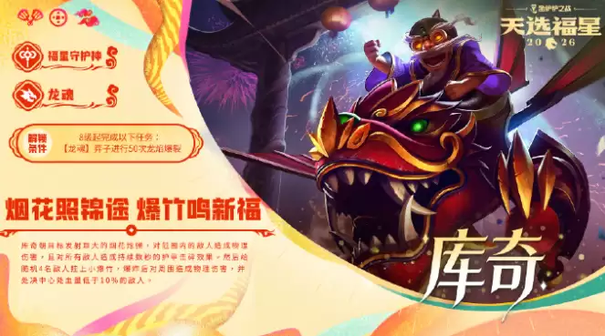 在2026年福星守护神活动中,解锁库奇的条件是:当你的等级达到8级或更高时,完成【龙魂】羁绊下的50次“龙焰爆破”攻击。作为福星守护神与龙魂双羁绊单位,库奇的技能可以向目标发射一枚绚丽的烟花炮弹,对范围内的敌人造成物理伤害并削减其护甲,同时还会为随机敌方单位挂上“小爆竹”,爆炸后能直接处决血量低于一定比例的目标。