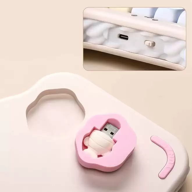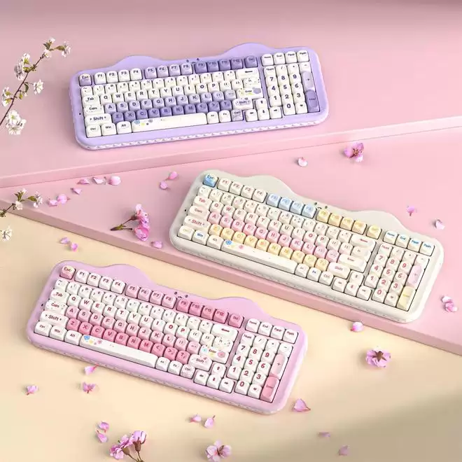 YUNZII C98延续了系列标志性的猫咪笑脸状态指示灯、“三明治”侧裙和小鱼造型2.4GHz接收器等萌系设计元素,提供椰奶V2轴与糖果轴两种线性轴体开关,包含粉、米、紫三种配色方案。