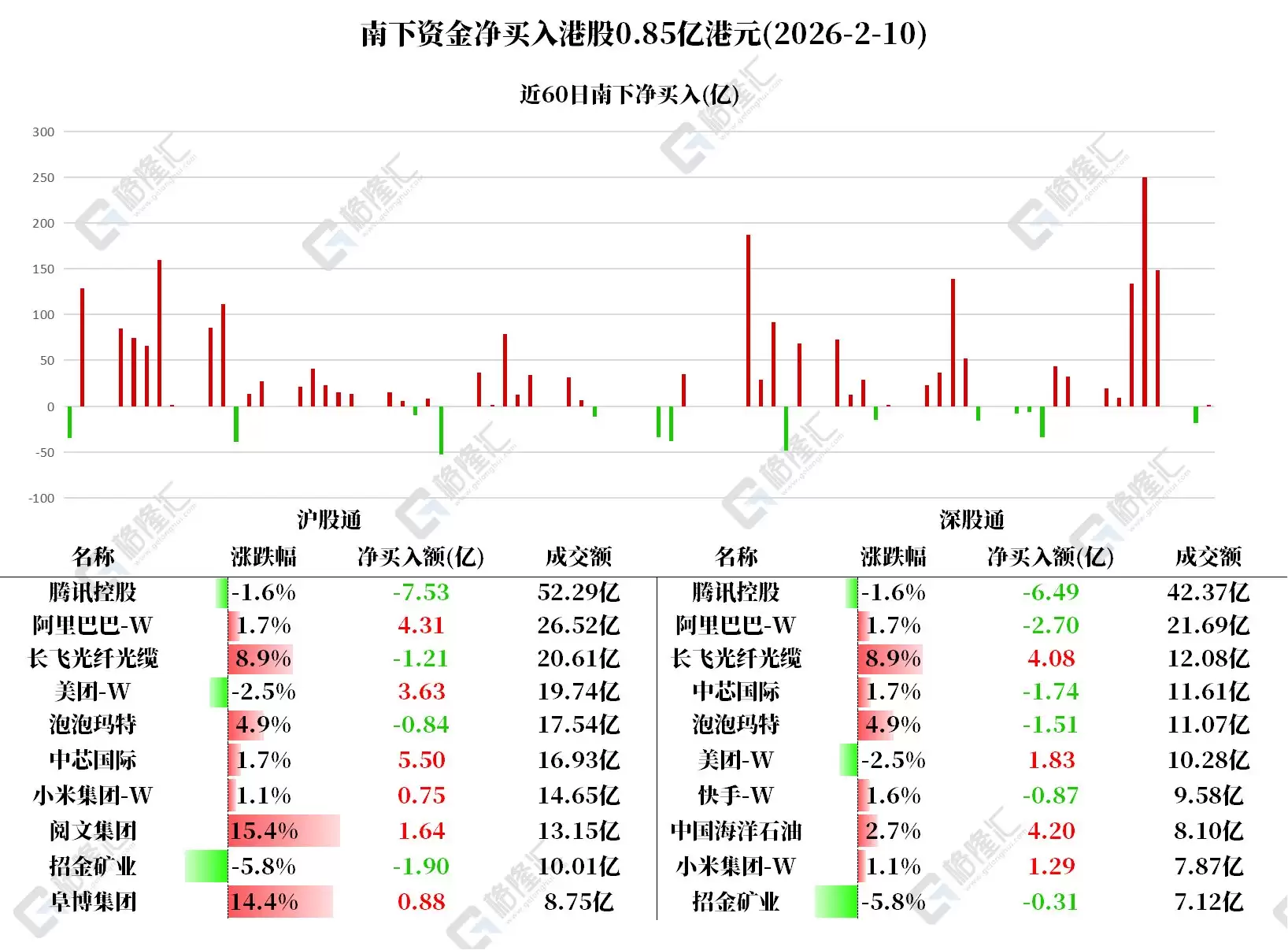 2月10日,南下资金今日净买入港股84.66亿港元,具体流向如下: