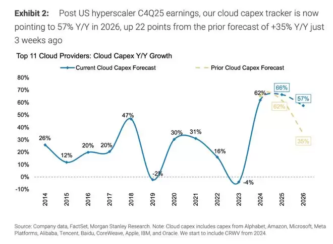 据追风交易台,摩根士丹利最新研究指出,2026年全球云计算资本支出预计将飙升至约7350亿美元,同比增长约60%,连续第三年增长率超过60%。这一预测较三周前大幅上调22个百分点,新增规模约1200