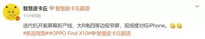 根据博主透露的信息来看,OPPO Find X10系列在外观上采用大R角四等边极窄屏,看来在视觉精致度上直接向行业标杆iPhone看齐。