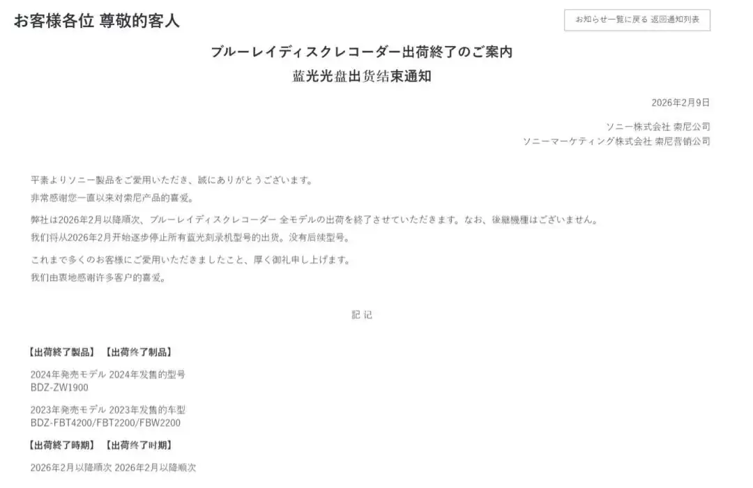 界面新闻消息,2月9日,蓝光光盘标准的核心开创者索尼发布官方公告,宣布将从2月起逐步停止旗下所有蓝光录像机产品的出货,并明确表示“无后续机型规划”,标志着这家科技巨头彻底退出家用蓝光录像机硬件市场。