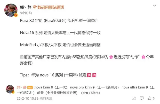 聊华为nova 16系列之前,先来看看华为当下的产品矩阵,博主称定位更高的Pura X2系列部分机型将进行价格调整,同时MatePad平板产品线也会优化定价。