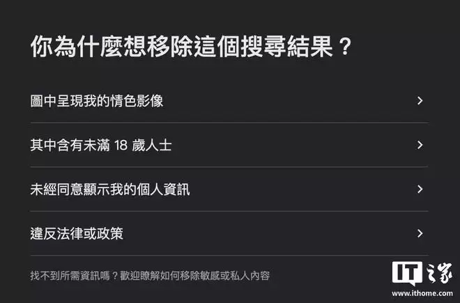 除了证件信息外,谷歌现在也允许用户删除未经授权发布的露骨图像,只需在图片搜索栏中点击图片旁边的三点菜单,然后选择“移除结果”并点击“这是我的性露骨图像”,提交删除请求后谷歌还会附上专业机构的链接,可提供情感支持及法律协助。