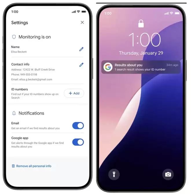 与此同时,这项功能的使用方式非常简便,用户只需点击“开始使用”,随后填写自己的个人联系信息。之后谷歌会依据填写资料扫描搜索结果,通过App通知、电子邮件提醒哪些搜索结果中出现了相关资料,用户可以要求谷歌删除这些搜索结果。