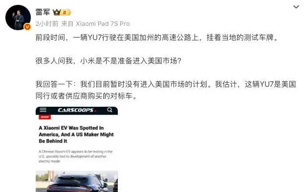 针对这一疑问,小米创办人、董事长兼CEO雷军在社交平台上做出了回应。他明确表示,小米汽车目前暂时没有进入美国市场的计划。雷军解释说,前段时间出现在美国加州高速公路上的那辆YU7,很可能是美国同行或供应商购买的对标车辆。
