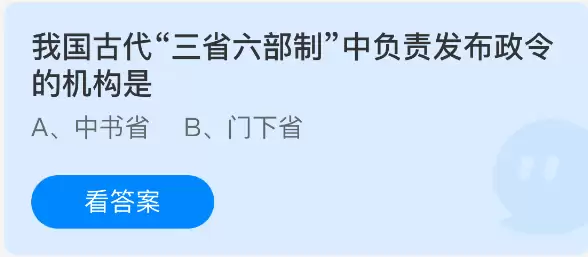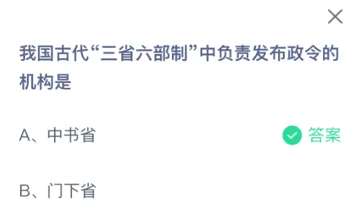 古代三省六部制中哪个机构负责发布政令?支付宝蚂蚁庄园今日答案