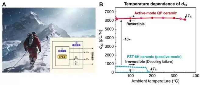 主动工作模式压电调控技术原理框图,及该模式下QP陶瓷的压电系数在室温至350°C的超宽环境温度内保持稳定。主动工作模式包含控温模块与偏压模块,可类比为攀登珠峰所需的保温服和氧气瓶。