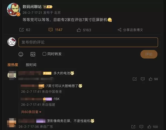 就在近日,某业内人士透露,有两家手机厂商正在测试7英寸大屏直板机,虽然目前还不能确定这款手机是否真的会发布,但从评论区的反馈来看,貌似正击中了一部分用户的潜在需求。