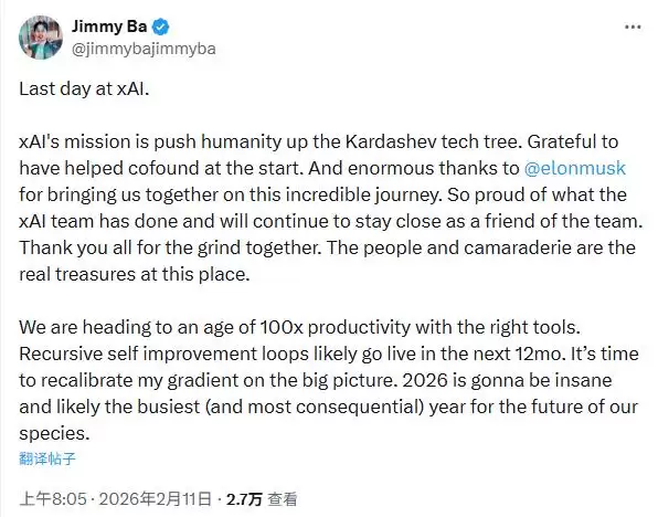 吉米·巴在离职声明中写道:“是时候重新校准我对大局的认知梯度了。2026年将非同寻常,很可能关乎人类未来最忙碌(也最具决定性)的一年。”同时,他也向马斯克表达了感谢,提及自己有幸在xAI初创阶段参与联合创立,珍惜这段非凡的共事旅程,并承诺未来将以团队挚友的身份与公司保持紧密联系。