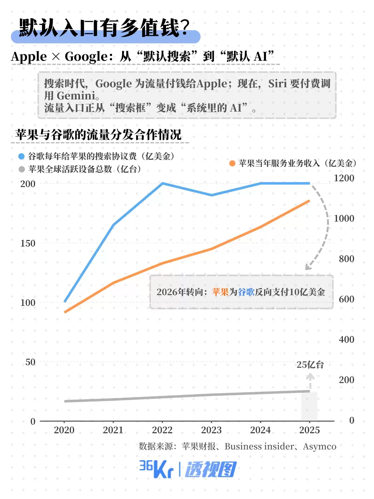 更深层次的变化来自商业模式的流向。过去十年,Google每年向Apple支付约200亿美元以保住其默认搜索引擎的地位;而据报道,未来Apple可能反过来支付约10亿美元以接入Google的Gemini模型。这意味着流量的分发权已经改变:入口的定价权正从浏览器搜索框转向系统级的人工智能助手。
