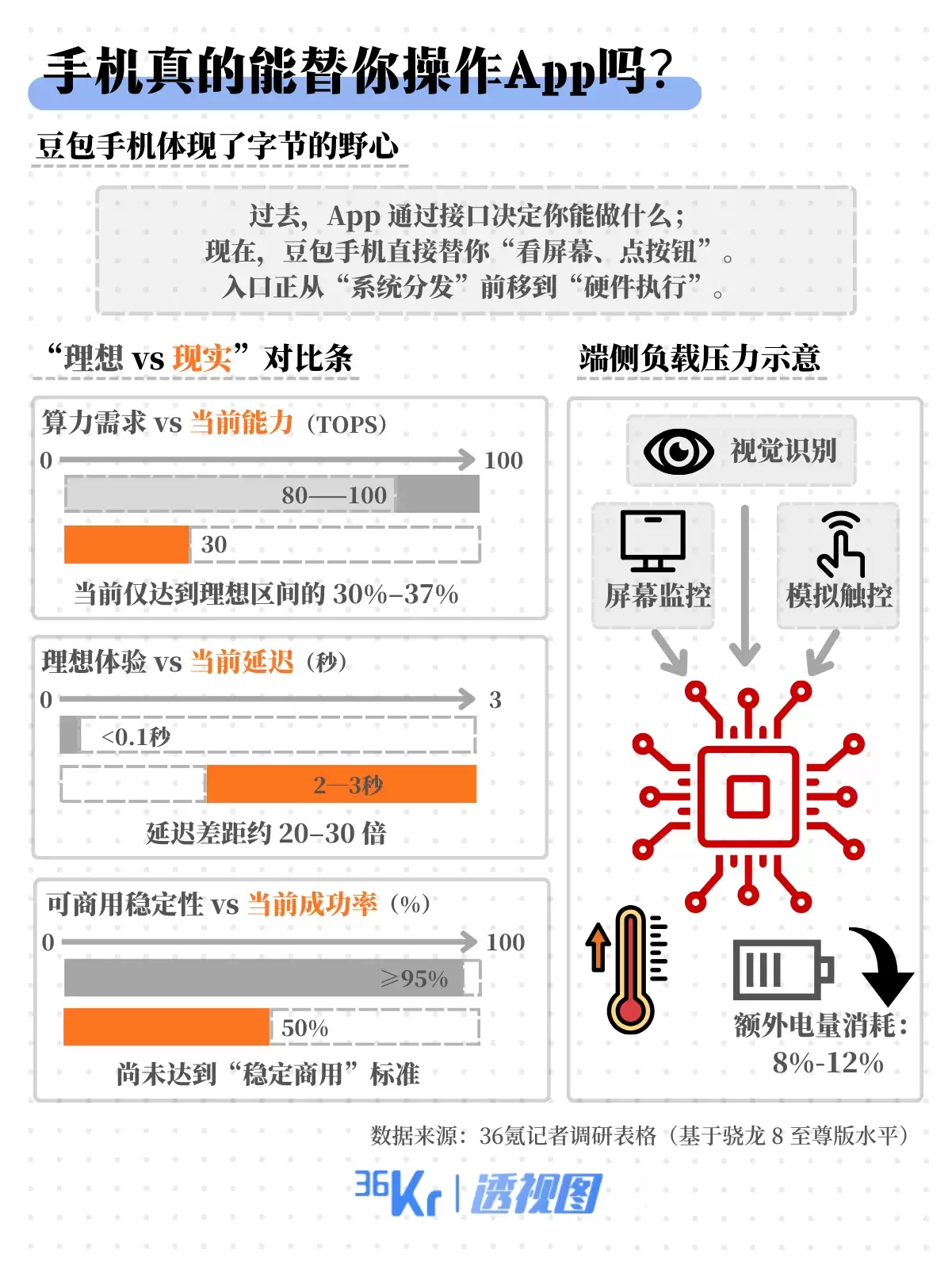 字节跳动选择了更为直接的路径——不等待系统接口的开放,而是利用“视觉识别技术”让AI自动“操作”App。这验证了从界面层进行技术接管的可能性,但在当前端侧算力(约30 TOPS)的瓶颈下,跨应用操作依然面临延迟(约3秒)与成功率(约50%)的现实挑战。方向已经被指明,但通向成熟的道路仍需时间。