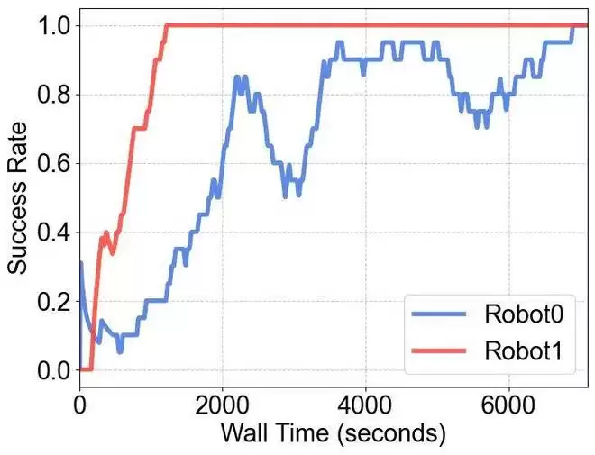 传统同步架构:收敛需要 8000+ 秒。RLinf-USER:收敛仅需约 1500 秒。