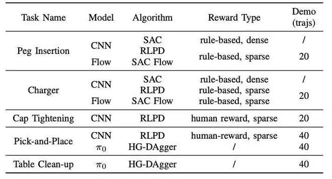 模型支持:CNN model,Flow matching model,VLA(如 PI0)算法支持:强化学习(如 SAC、SAC Flow)、模仿学习(如 HG-DAgger)奖励函数支持:规则奖励、人工奖励、奖励模型
