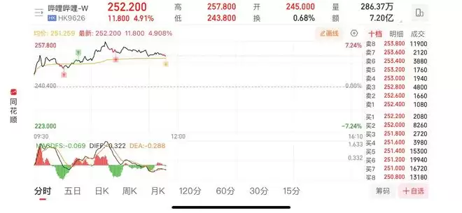2月11日早盘,哔哩哔哩-W(09626.HK)股价一度飙升超过7%,盘中最高触及257.8港元/股。