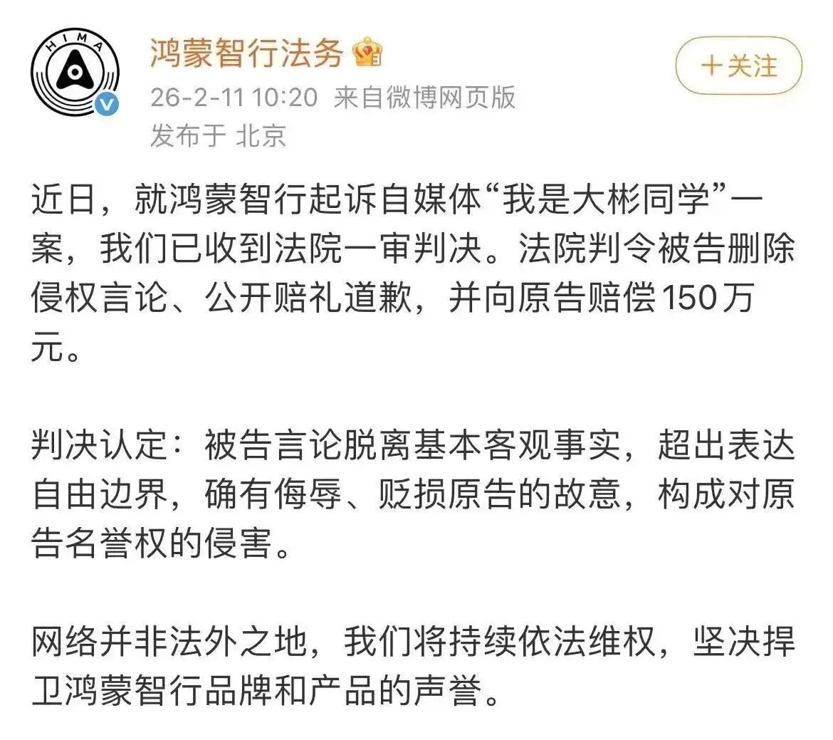 2月11日,鸿蒙智行法务部门发布声明称,近日就起诉自媒体“我是大彬同学”一案,已收到法院的一审判决结果。法院判定被告需删除侵权言论、公开赔礼道歉,并向原告赔偿150万元。