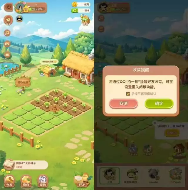 以近期上线的经典农场为例,在保留“种菜”“偷菜”核心玩法的基础上,升级了清新细腻的画面风格,并新增社交互动机制:偷取好友作物后,可对其“拍一拍”;农场状态可与QQ状态同步;系统还会推荐“可能认识的农场玩家”,促进轻娱乐中的社交延伸。这些设计,让经典玩法融入了当下社交习惯。