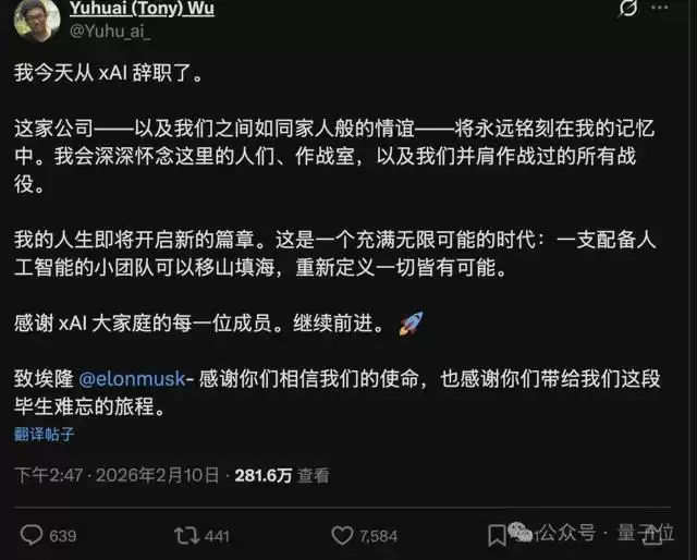 他在离职声明中感谢了马斯克,并称2026年将是”人类未来发展史上最繁忙(也最具决定性意义)的一年”。