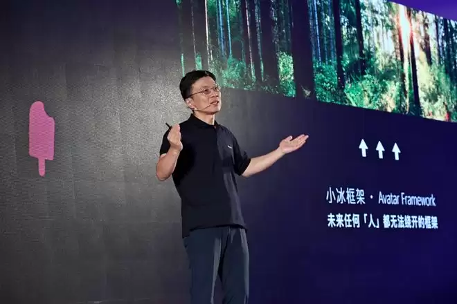 2020年8月20日,小冰第八代年度发布会上,沈向洋博士介绍了小冰框架的理念。图源:澎湃新闻
