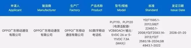 据悉,型号为PLP110、PLP120的OPPO旗下新机于近日通过了认证。认证信息显示,其支持 80W 快充,配备型号为VCB8OACH的电源适配器。