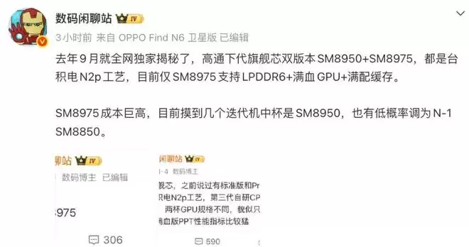 参考博主@数码闲聊站 的爆料来看,高通下代旗舰芯双版本SM8950、SM8975,都是台积电N2p工艺,目前仅SM8975支持LPDDR6+满血GPU+满配缓存。