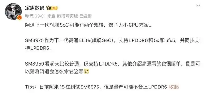目前小米18在测试SM8975,但是量产可能不会上LPDDR6。
