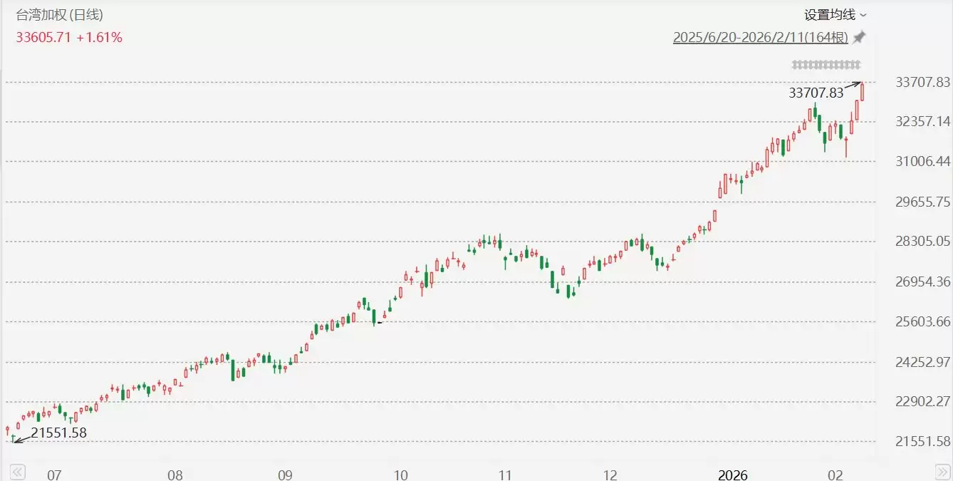 台股加权指数在2月11日盘中一度冲高1.92%,触及33707.83点,再度刷新历史纪录;终场收敛涨幅,收涨1.61%,报33605.71点。年内至今,台湾加权指数累计涨幅已达16.03%。