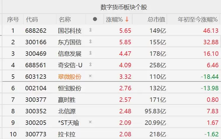 格隆汇2月11日|A股市场数字货币概念股走强,其中,御银股份一度触及涨停,国芯科技涨超5%,信息发展涨超4%,翠微股份涨超3%,恒宝股份、赢时胜涨超2%。