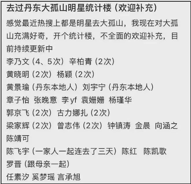 目前,已经有网友整理了前往大孤山的明星名单,根据不完全统计,去过大孤山的明星名人竟然近50人,还是仅仅算了近期的,时间再往前数,还有关之琳、方芳、姜育恒等老牌明星去过大孤山,细数下来,早就超过50人了。
