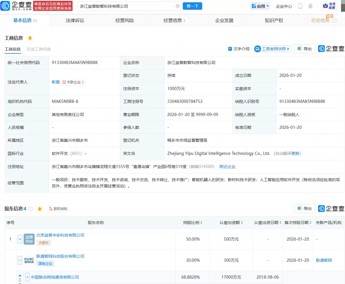 据企查查APP信息显示,近日,浙江益普数智科技有限公司正式成立,其法定代表人为**,注册资金达1000万元。公司的经营范围广泛,涵盖了智能机器人研发、新材料技术开发以及人工智能应用软件开发等多个前沿科技领域。股权穿透图进一步揭示,该公司由北京益普华安科技有限公司、中国联合网络通信有限公司旗下的联通智网科技股份有限公司等多家企业共同持股。