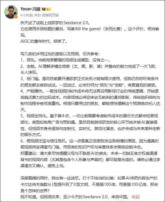 文末,他写道:“我很庆幸,至少今天的Seedance 2.0,来自中国。”