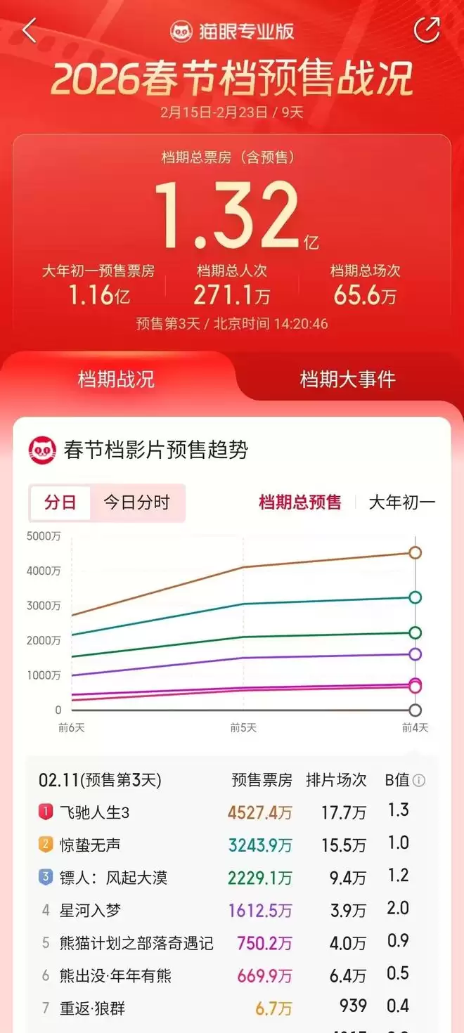 南都N视频记者注意到,对比前两年春节档预售票房,截至档期前4天的票房总预售,2026年春节档目前低于2025年和2024年春节档的前四天预售,仅为1.3亿元,2025年和2024年的这一数据分别为4.96亿和3.16亿。