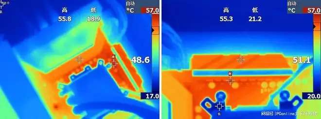 利用热成像仪对供电部分进行温度观察,最热源在顶部的供电模块上,顶部散热马甲的表面温度为51.1度,左侧散热马甲的表面温度为48.6度,温度控制方面着实较为出色。因此若预算有限的情况下,购买9850X3D的用户可以考虑B850M刀锋钛MAX,完全不用担心功耗与温度控制压力。