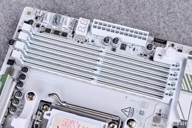 标志性的龙纹Logo以RGB灯效的形式巧妙地嵌入在I/O护盖之上,点亮瞬间,那抹流动的光效仿佛赋予了主板生命,在纯白的机箱氛围中显得格外深邃。对于正在组建“全白海景房”主机的玩家来说,这张主板无疑是颜值拼图中至关重要的一块。