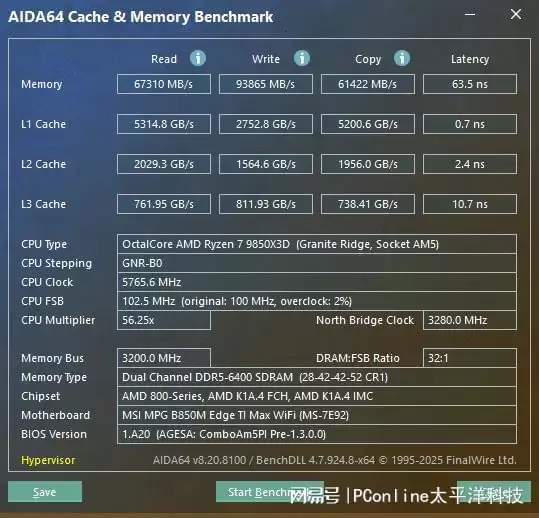 理论性能与游戏性能我们还是简单地测试了下,B850M刀锋钛MAX能够完美释放9850X3D的全部潜能,性能表现与我们之前首发时使用的微星X870E CARBON Wi-Fi暗黑主板性能相当。