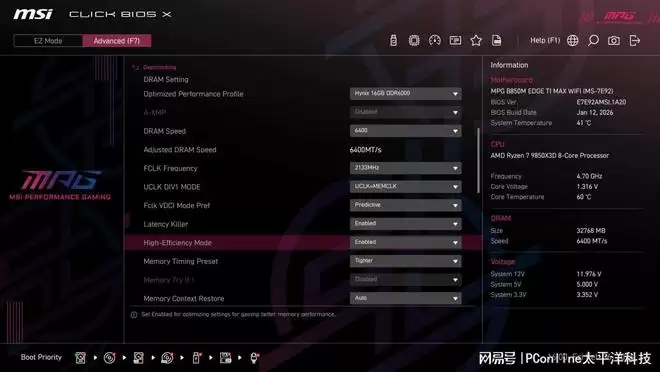 对于普通玩家,开启EXPO即可享受低延迟、高带宽的甜点性能;而对于极客玩家,配合微星的高效模式(High Efficiency Mode),可以进一步压榨小参,将内存延迟降低至纳秒级的极致水平。