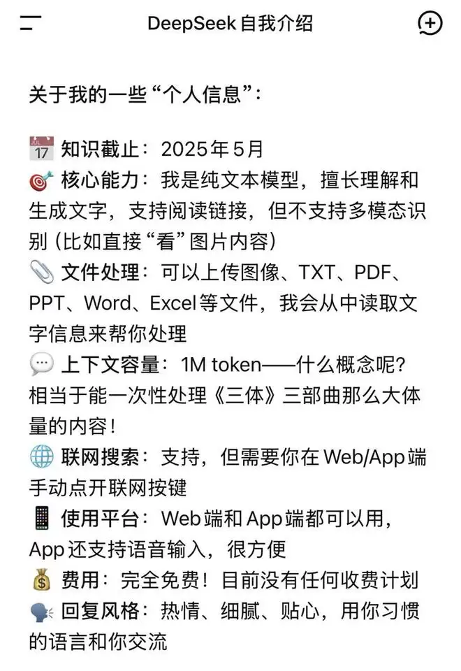 2月11日,部分用户打开DeepSeek App后收到更新版本的提示。APP更新后(1.7.4),用户可体验到DeepSeek最新模型。本次升级后,模型上下文长度将从128K扩展至1M,接近提升10倍;知识库更新至2025年5月,多项核心能力获得实质性提升。