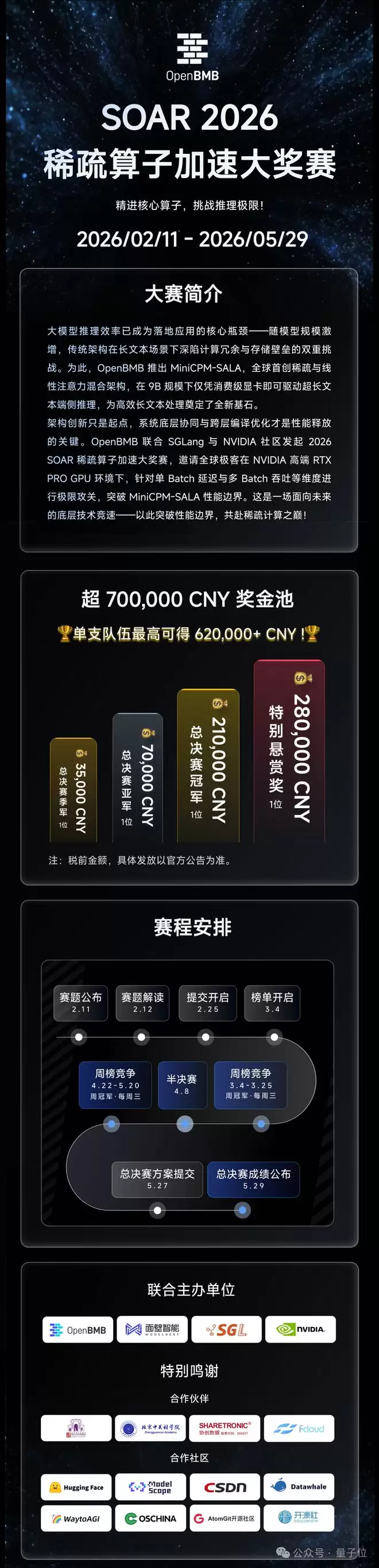 除此之外,面壁还以OpenBMB社区名义,联合SGLang与NVIDIA发起2026稀疏算子加速大奖赛(SOAR),将这套scaling能力直接交到开发者手中,推动端侧Agent部署的性能突破。