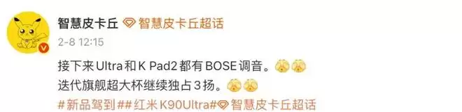 博主@智慧皮卡丘 近日的爆料显示,“接下来Ultra和K Pad2都有BOSE调音。迭代旗舰超大杯继续独占3扬。”