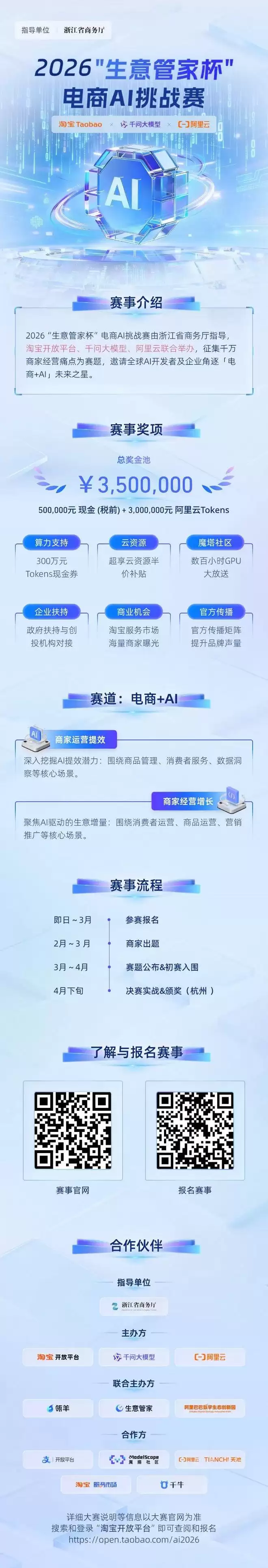 这也意味着 AI 与电商行业的结合有了更多的可能性。2 月 9 日,淘宝、千问大模型、阿里云联合发起了 2026「生意管家杯」电商 AI 挑战赛。大赛总奖金池的价值高达 350 万元,包括 50 万元现金奖励和 300 万元阿里云 Tokens。