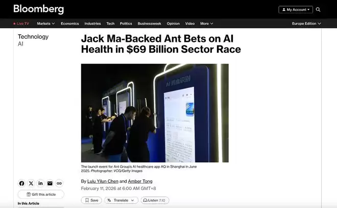 【环球网科技综合报道】2月11日,彭博社发布深度分析指出,在全球医疗人工智能的竞争格局中,中国正凭借政策红利、科技巨头的深度参与以及庞大的用户基数,展现出显著的技术优势。以蚂蚁集团旗下AI健康助手“蚂蚁阿福”为例,中国科技企业正通过“AI医生分身”等前沿技术,对规模高达690亿美元的数字健康赛道发起冲击。