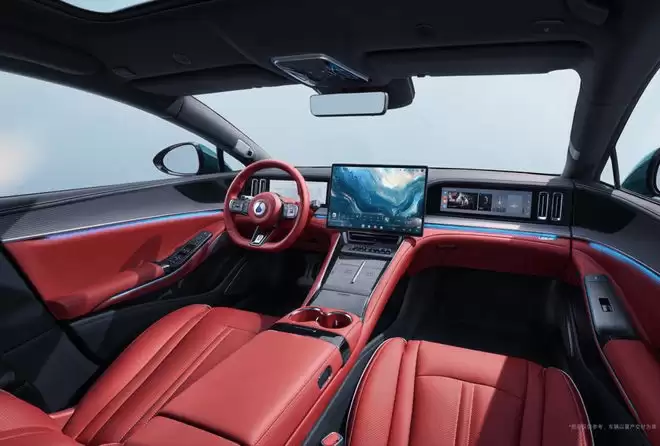 内饰设计以“熔岩红”为主色调,搭配真碳纤维饰板,营造出豪华与运动兼具的座舱氛围。一体式运动座椅采用颈部高亮黑装饰,并印有“Z9GT”专属标识,强化了车型的身份认同感。驾驶区域配备三辐式多功能方向盘、BOOST竞速拨片及金属怀挡杆,空调出风口采用镀铬包边工艺,细节之处彰显精致质感。