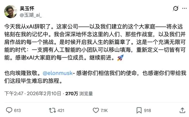 这已经是继去年 8 月 Igor Babuschkin 离职后,xAI 失去的第二位联合创始人。Wu 负责的恰恰是 AI 推理能力——这个被业内认为是下一代 AI 系统核心竞争力的关键技术方向。
